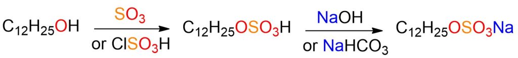 From an industrial perspective, the production of SDS occurs through the sulfonation of lauric alcohol, which reacts with sulfur trioxide (SO₃) or chlorosulfonic acid (ClSO₃H). This initial reaction is followed by a treatment with sodium hydroxide (NaOH) or sodium bicarbonate (NaHCO₃) (see figure below) [1].