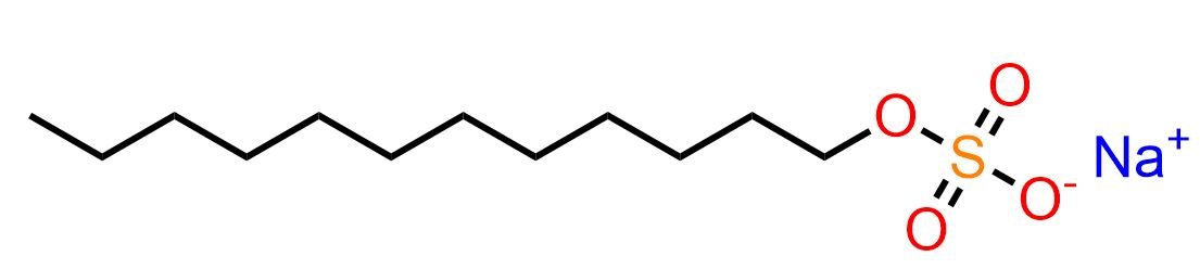 SDS stands for Sodium Dodecyl Sulfate, also known as SLS, or Sodium Lauryl Sulfate. Its chemical formula consists of 12 carbon atoms, 25 hydrogen atoms, 4 oxygen atoms, and 1 sulfur atom. The figure below illustrates the structural formula of SDS.