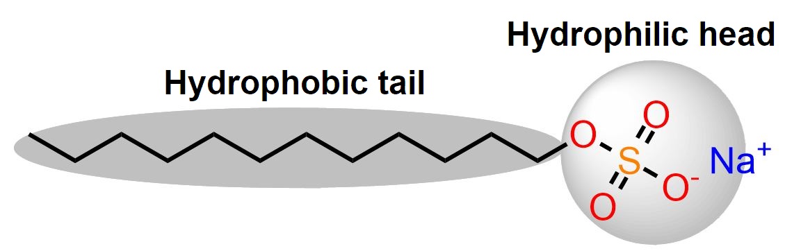 We previously mentioned that SDS has a dual nature: a polar head and a hydrophobic tail. This structure is fundamental to its function. In the presence of water and dirt (such as greasy or oily substances), the molecule orients itself with the polar head facing the water (which is also a polar substance) and the hydrophobic tail directed towards the non-polar substance, such as grease.